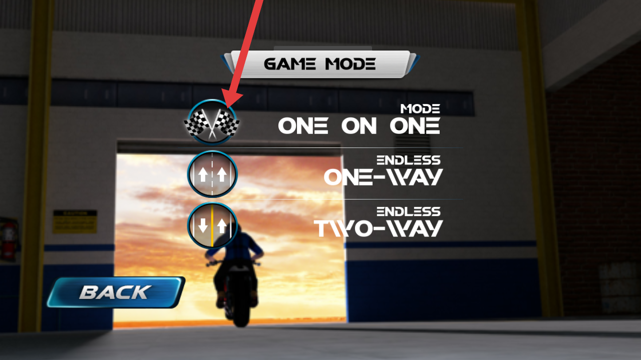 1、在模式的選擇界面,點(diǎn)擊ONE ON ONE的模式圖標(biāo),開啟一對(duì)一摩托競(jìng)速對(duì)決,開啟競(jìng)技挑戰(zhàn)。