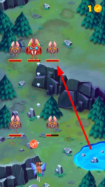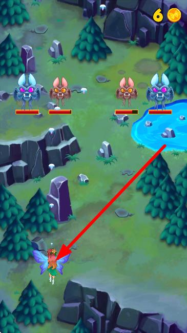 3、控制箭頭指向的仙女角色,通過滑動(dòng)點(diǎn)擊躲避怪物攻擊,調(diào)整位置,持續(xù)射擊,消滅所有敵人。