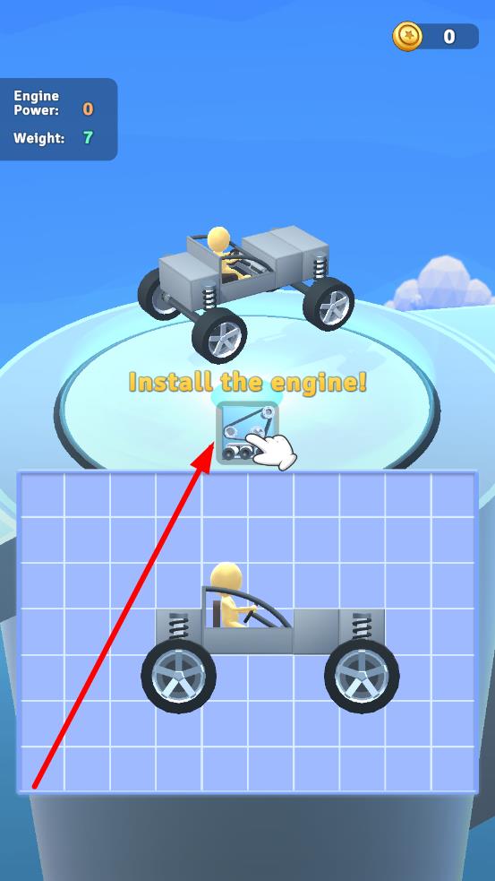 1、進(jìn)入造車界面,按提示“Install the engine!”,將發(fā)動(dòng)機(jī)部件拖至汽車對(duì)應(yīng)位置完成組裝,基礎(chǔ)造車后開啟賽道挑戰(zhàn)。