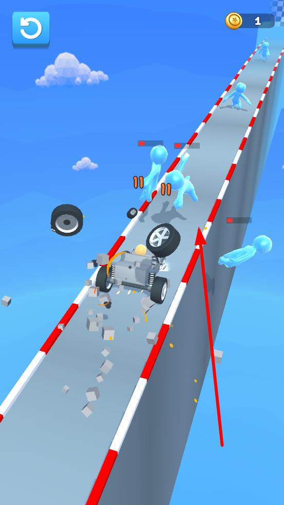 2、在賽道上,操控汽車左右移動(dòng)、跳躍,躲避藍(lán)色敵人、掉落輪胎等障礙,保持車輛的整體完整,并且沖向終點(diǎn)。