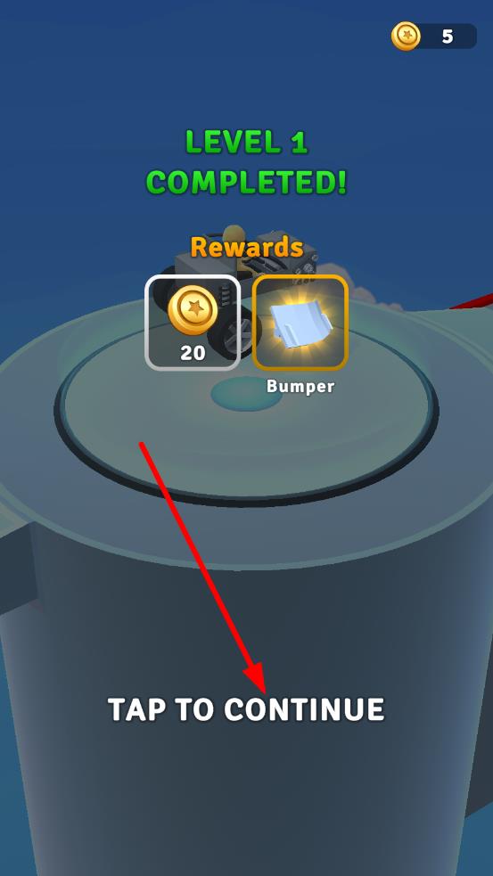 3、通關(guān)后,界面顯示“LEVEL 1 COMPLETED!”,點(diǎn)擊“TAP TO CONTINUE”,領(lǐng)取金幣、Bumper等獎(jiǎng)勵(lì),用于升級(jí)車輛部件。