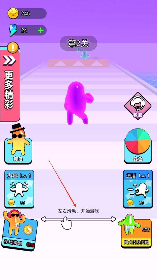 1、根據(jù)箭頭提示左右滑動(dòng),開(kāi)始游戲,操縱軟糖超人在賽道上移動(dòng),收集軟糖,讓超人壯大起來(lái)。