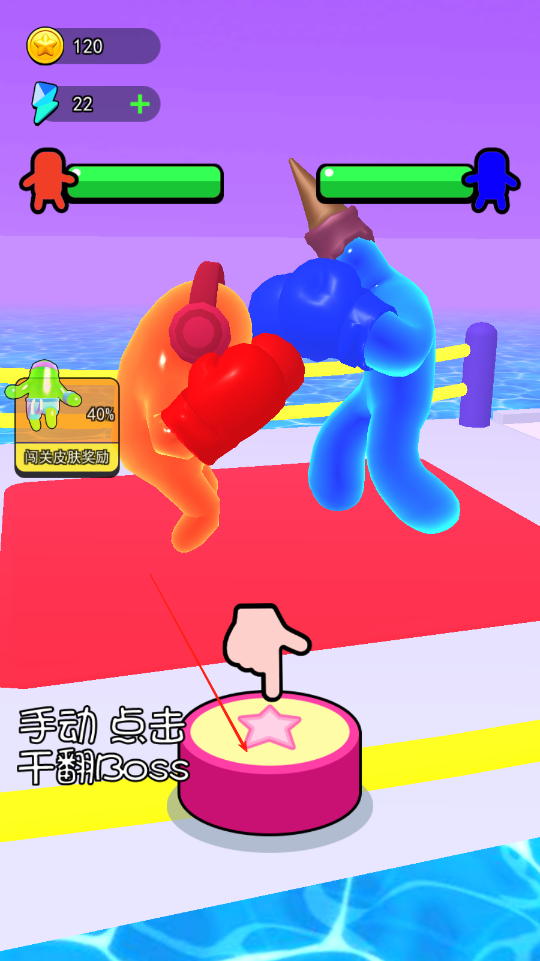3、沖過(guò)終點(diǎn)線后,根據(jù)箭頭提示不停點(diǎn)擊按鈕,和boss對(duì)打,點(diǎn)擊的速度越快,扣除的血量越多,將boss擊倒即可獲勝。