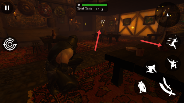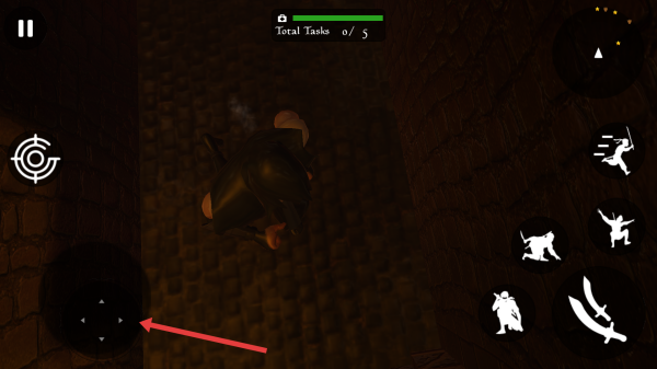 2、關(guān)卡中,用左側(cè)搖桿方向鍵控制忍者移動(dòng),在昏暗巷道小心潛行,避開(kāi)敵人。