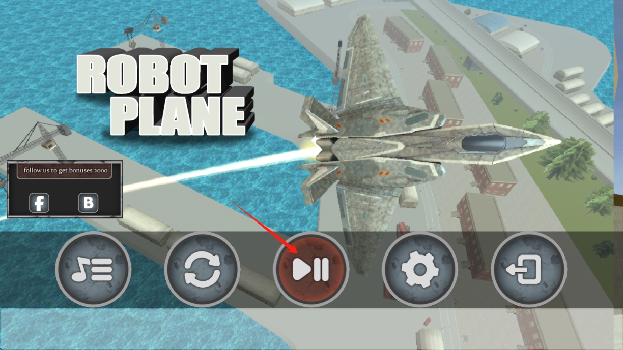 1、在Robot-Plane啟動界面,點(diǎn)擊紅色播放按鈕,開啟機(jī)器人飛機(jī)冒險(xiǎn),進(jìn)入游戲世界,點(diǎn)擊開始游戲。