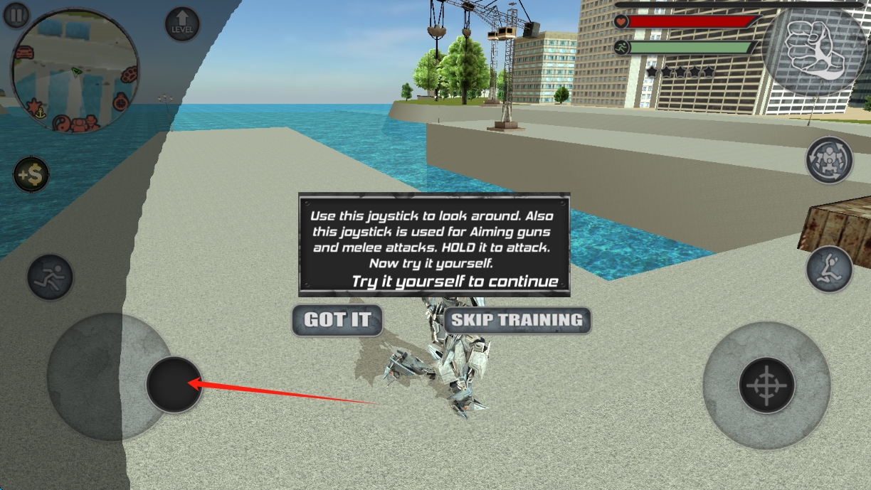 2、游戲內(nèi)教學(xué)場景,跟隨提示,使用虛擬搖桿,熟悉操控方式,為后續(xù)戰(zhàn)斗做準(zhǔn)備,撥動輪盤移動。