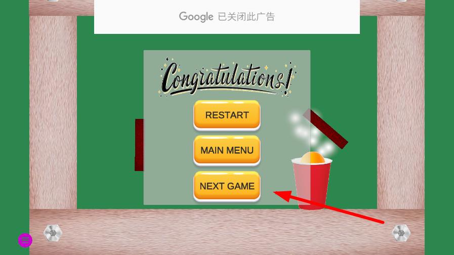 3、小球精準(zhǔn)入杯后,界面彈出“Congratulations!”,點(diǎn)擊“NEXT GAME”按鈕,奔赴下一關(guān),挑戰(zhàn)更復(fù)雜的布局與物理謎題。