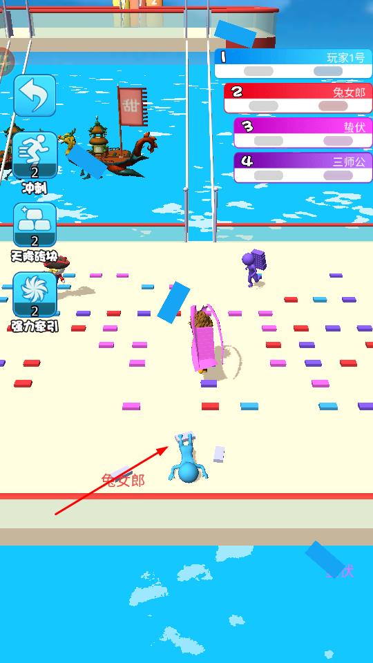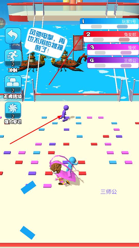3、奔跑時留意道具與對手動態(tài),合理使用強力牽引等技能,爭取率先抵達終點,就能夠看到排名。