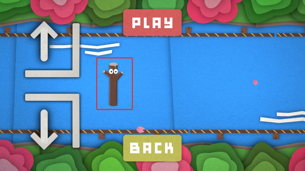1、點擊上方紅色PLAY按鈕開啟游戲,操控樹樁角色在河道中順流前行,提前觀察路線,為躲避后續(xù)障礙鋪墊。