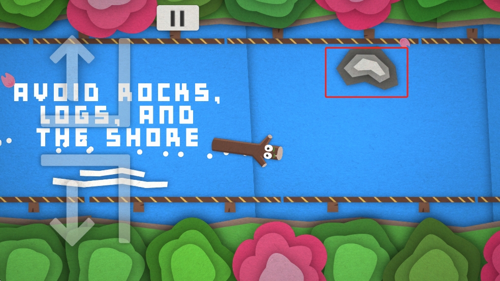 2、游玩時遵循提示,避開紅色方框內(nèi)的巖石,同時遠(yuǎn)離河道岸邊,維持樹樁在安全水域移動,穩(wěn)步突破關(guān)卡障礙。