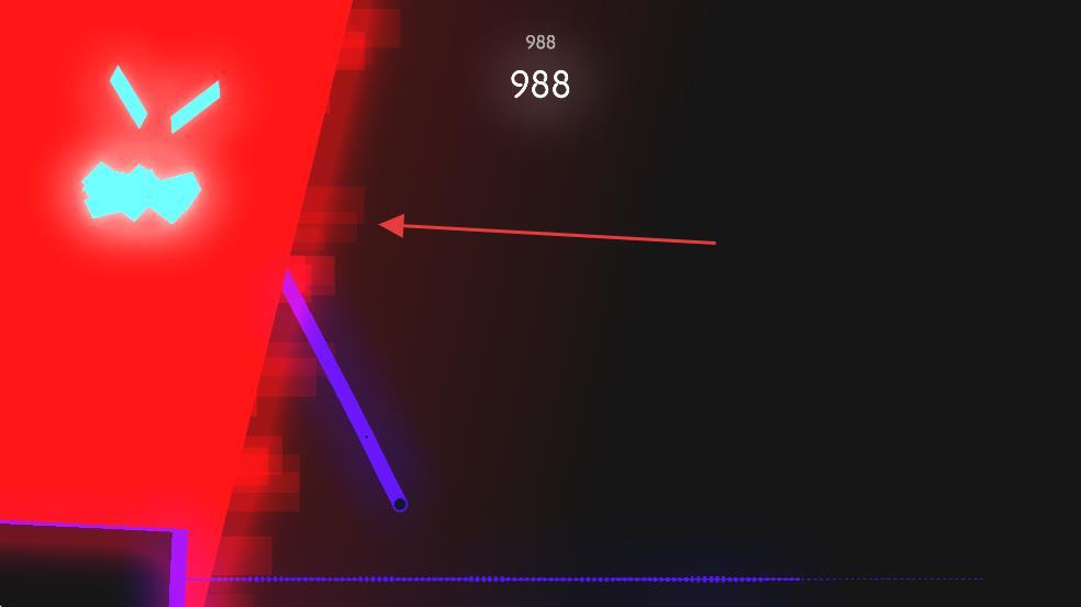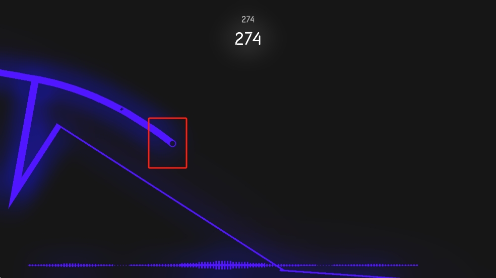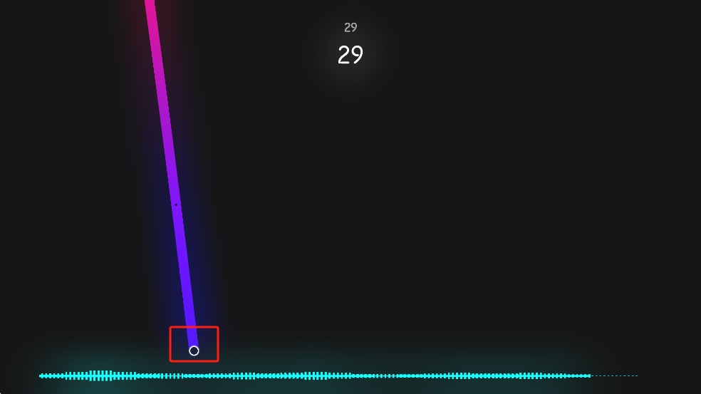 1、操控紅色方框內(nèi)的發(fā)光圓點(diǎn),跟隨底部聲波節(jié)奏移動,沿紫色軌跡延伸,持續(xù)繪制線條積累分?jǐn)?shù)。