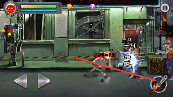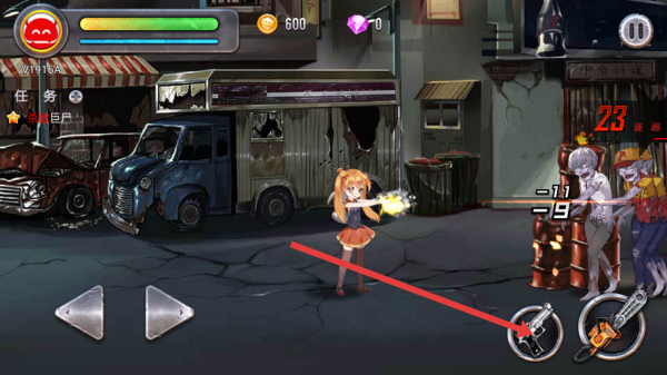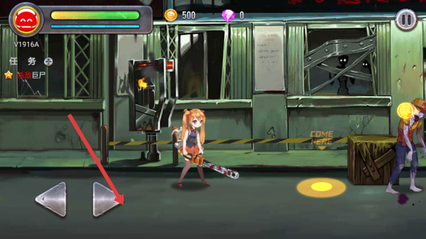 1、進(jìn)入游戲后,通過(guò)左下角的左右箭頭按鈕控制角色移動(dòng),在城市的廢墟場(chǎng)景中冒險(xiǎn),注意躲避僵尸的攻擊。