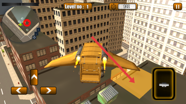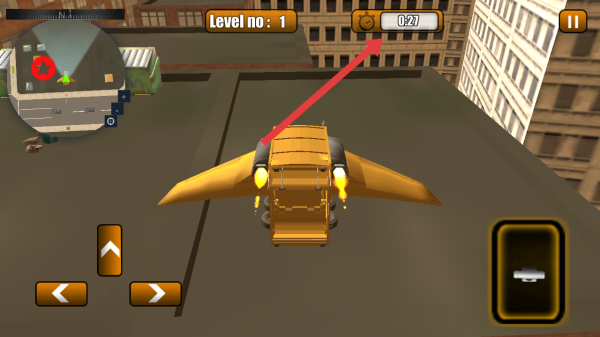 2、需要點(diǎn)擊右側(cè)黃色的按鈕,激活飛行的模式,使卡車展開機(jī)翼升空,跨越城市建筑障礙,到達(dá)目的地。