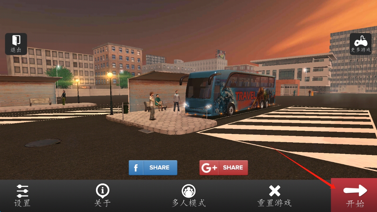 1、在游戲啟動界面,點擊開始,開啟巴士模擬駕駛冒險,進入游戲世界,點擊按鈕開始游戲。