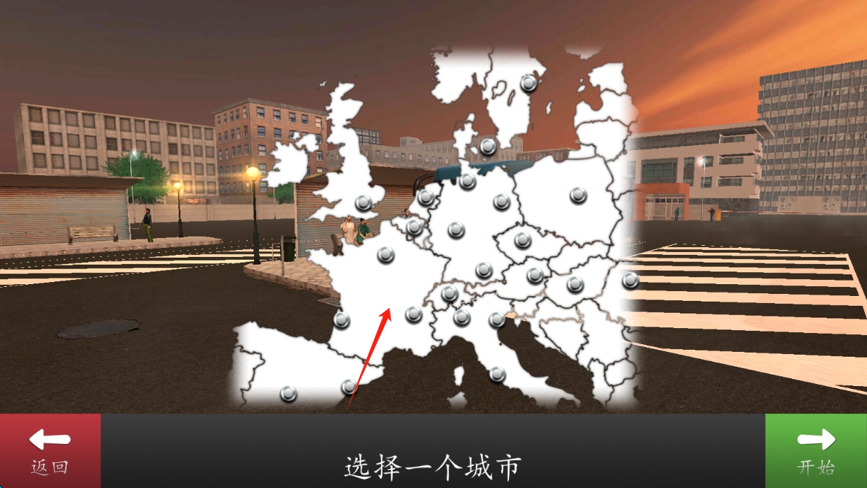 2、進入城市選擇界面,跟隨箭頭提示,選擇一個城市,確定駕駛目的地,為巴士駕駛?cè)蝿兆龊脺蕚洹?