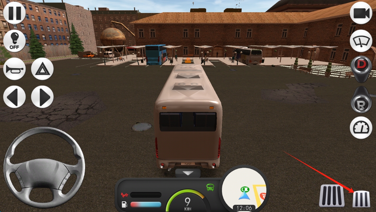3、在駕駛操作場景中,根據(jù)箭頭提示,操作油門踏板,控制巴士行駛速度,躲避障礙,遵守交通規(guī)則,順利完成駕駛?cè)蝿?,推進游戲進度。