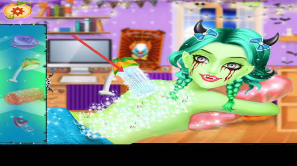 1、點開給有著萬圣節(jié)裝扮的角色進行打扮,首先從身體的清潔入手,點擊紫色的香皂給后背清潔。