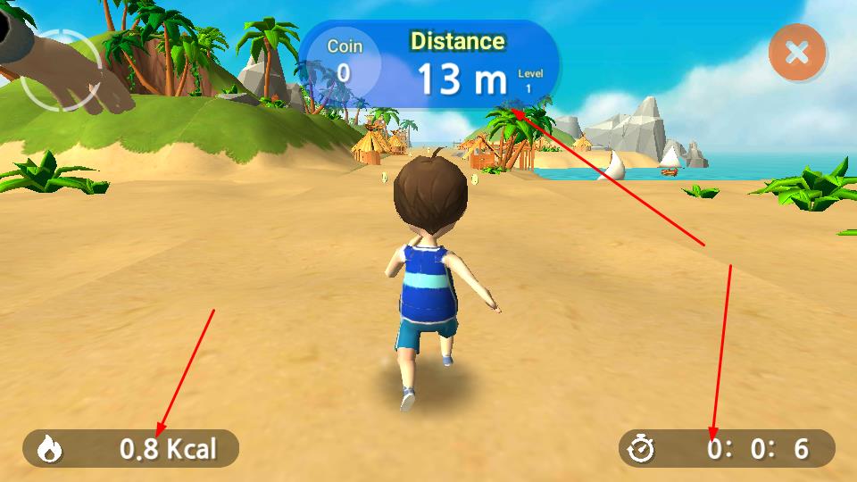 2、在跑步環(huán)節(jié),關注距離、消耗熱量等數(shù)據(jù),控制角色在沙灘場景奔跑,才能夠持續(xù)推進運動進程。