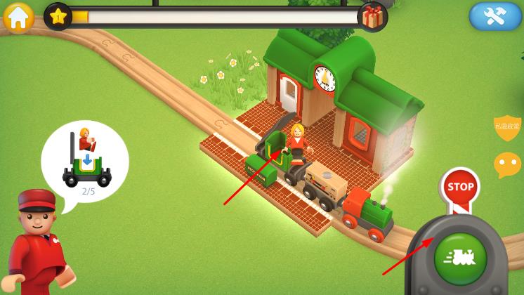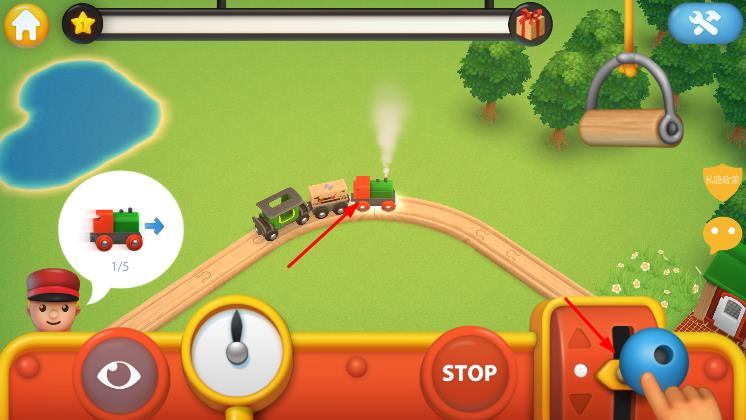 2、在鐵軌場景中,通過操作按鈕,控制火車行駛,按照任務提示收集車廂、運輸貨物,讓火車在軌道上運行。