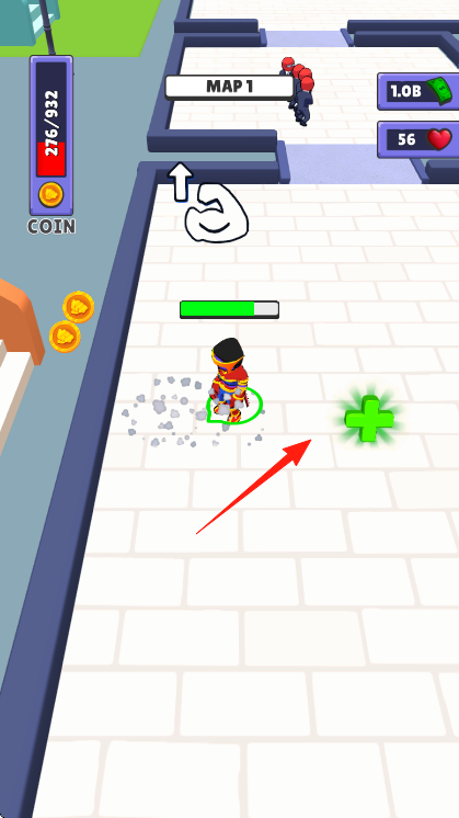 3、戰(zhàn)斗后,跟隨箭頭指引,前往綠色加號道具處,拾取恢復(fù)血量,繼續(xù)探索關(guān)卡,消滅剩余敵人。