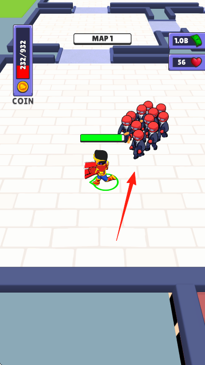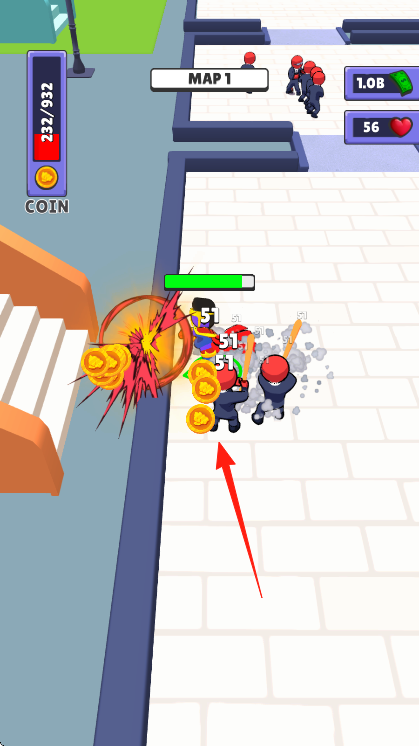 2、靠近敵人后,自動觸發(fā)攻擊,擊敗敵人獲取金幣,按箭頭方向推進,清理路徑敵人。