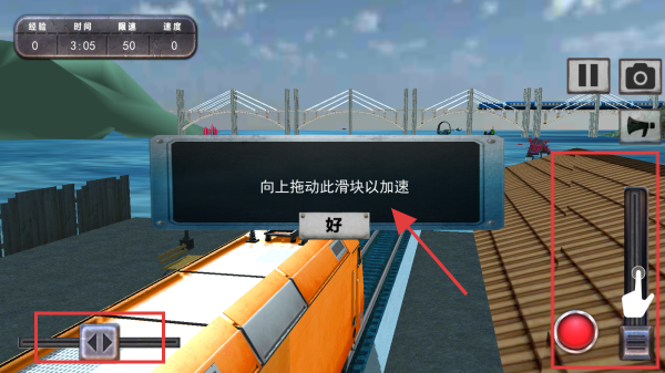 3、在火車駕駛界面,按照提示向上拖動右側(cè)的滑塊以加速火車,同時利用左側(cè)的按鈕進行方向控制,完成火車駕駛?cè)蝿?wù)。