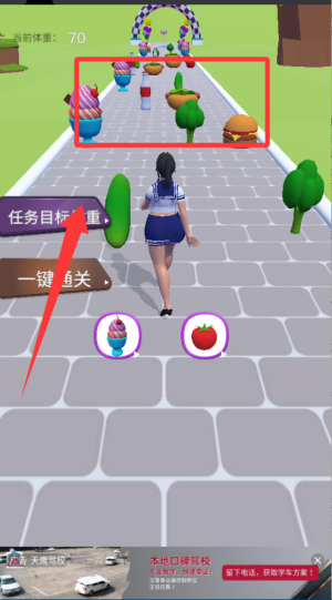 2、合理選擇拾取的食物,需要變大時(shí)吃漢堡,需要變小時(shí)吃蔬菜。