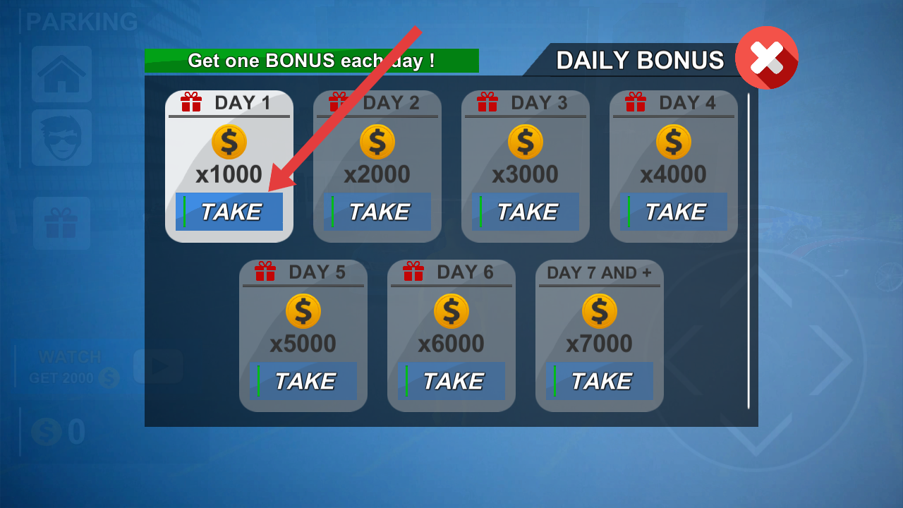 1、進入每日獎勵界面,點擊DAY1的TAKE按鈕,領(lǐng)取1000金幣獎勵,連續(xù)登錄可以解鎖更高額度獎勵。