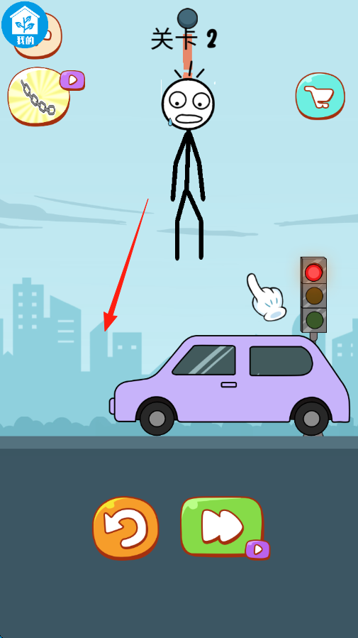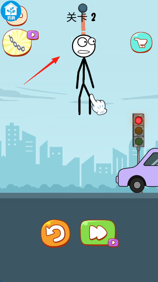 1、關(guān)卡2開始,點擊懸掛的火柴人,按箭頭指引,使其下落,注意躲避下方汽車。