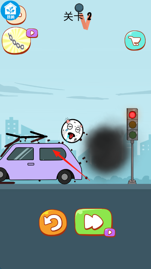 3、若火柴人被汽車撞到,觸發(fā)失敗動畫,可點擊左下角重置按鈕,重新開始關(guān)卡,再次嘗試脫險。