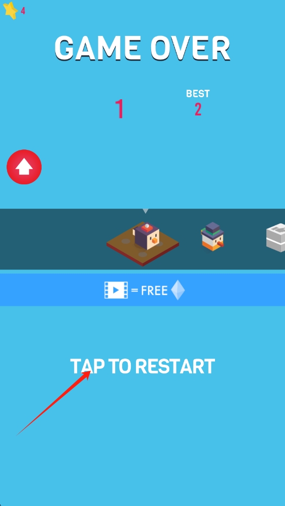3、在游戲結(jié)束界面,根據(jù)箭頭提示,點(diǎn)擊TAPTORESTART,重新開始游戲,繼續(xù)挑戰(zhàn),推進(jìn)游戲進(jìn)度。