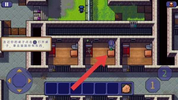 3、呈現(xiàn)監(jiān)獄場(chǎng)景,有走近你的桌子點(diǎn)擊①打開(kāi)桌子,拿走里面所有東西的操作提示,玩家操控角色在監(jiān)獄房間活動(dòng),屬于收集物品的基礎(chǔ)流程環(huán)節(jié)。