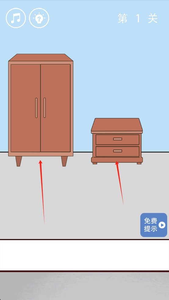 1、進(jìn)入第1關(guān),觀察場(chǎng)景有衣柜和床頭柜,根據(jù)箭頭指引,先點(diǎn)擊打開衣柜與床頭柜,尋找關(guān)鍵物品。