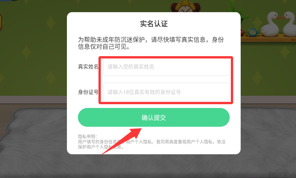 2、填寫真實(shí)的姓名和真實(shí)身份證號(hào)碼點(diǎn)擊確認(rèn)提交。