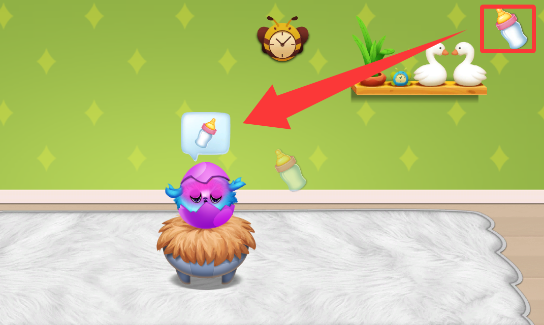 4、拖動(dòng)紅色框框的奶瓶喂它喝奶。