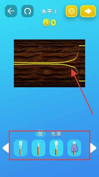 3、在游戲的木工場景中,根據(jù)紅色箭頭所指的方向,選擇合適的工具,對(duì)木材進(jìn)行加工,完成木工任務(wù),獲取游戲得分和獎(jiǎng)勵(lì)。