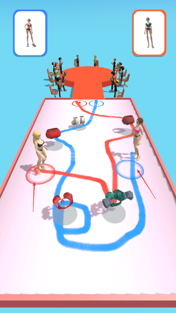 2、仔細(xì)看清兩個(gè)女孩要穿的服飾,容易混淆,按照?qǐng)D中畫線,讓兩個(gè)女孩穿上正確的服飾,走上T臺(tái)。