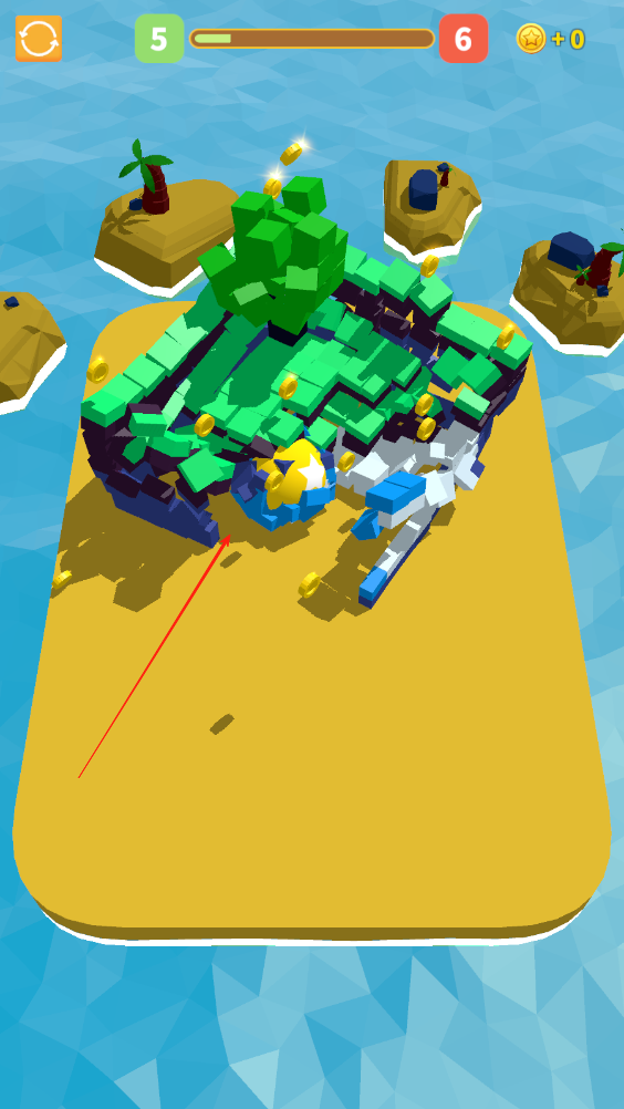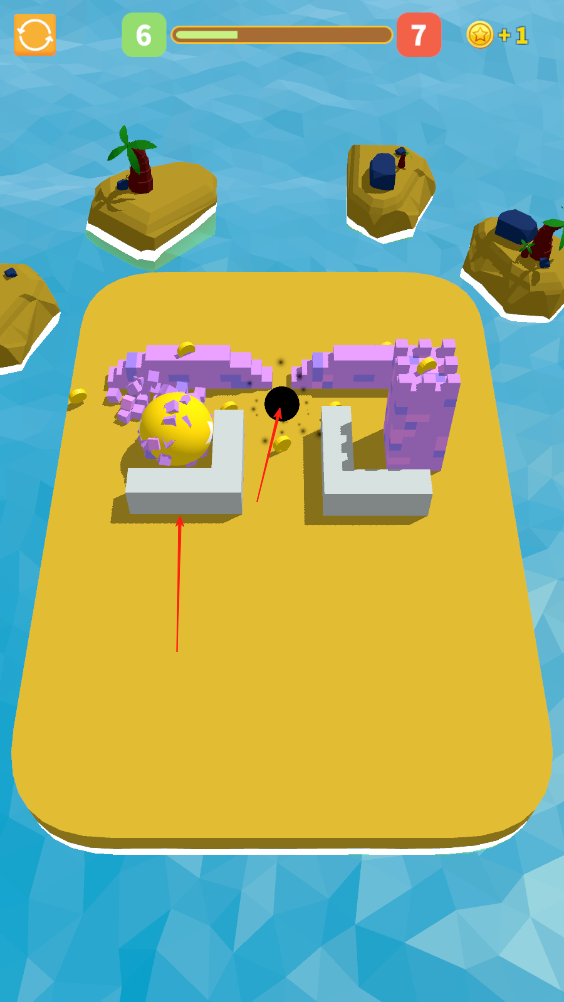 3、這一關(guān)卡不要直接撞擊上去,建筑底下藏著黑洞,輕輕一撞沿著黑洞將所有碎片都粘干凈,不要靠近黑洞。