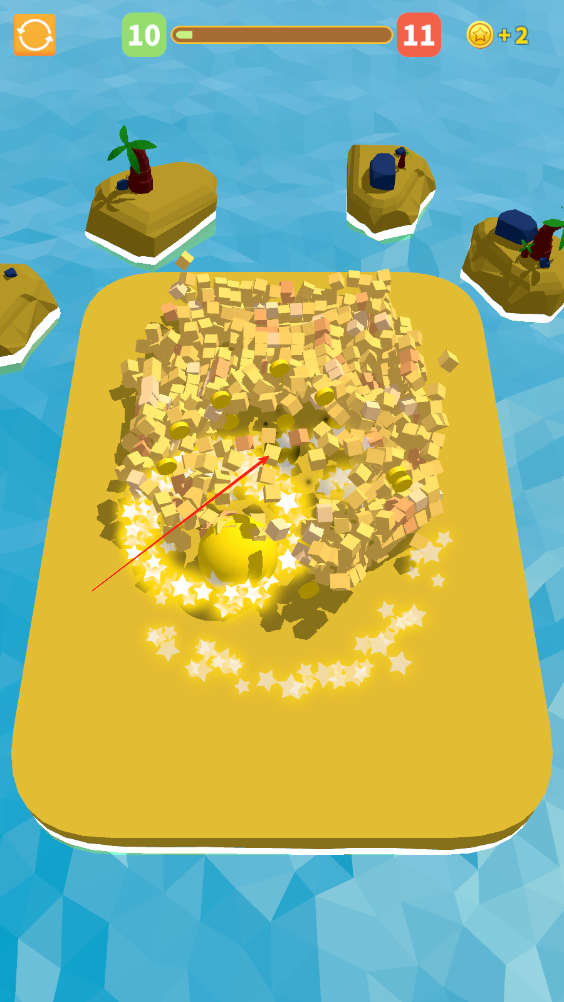 1、用球撞擊完整的建筑,建筑一撞即毀,滾動小球粘地上的碎片,將所有的碎片都粘干凈,即可通關(guān)。
