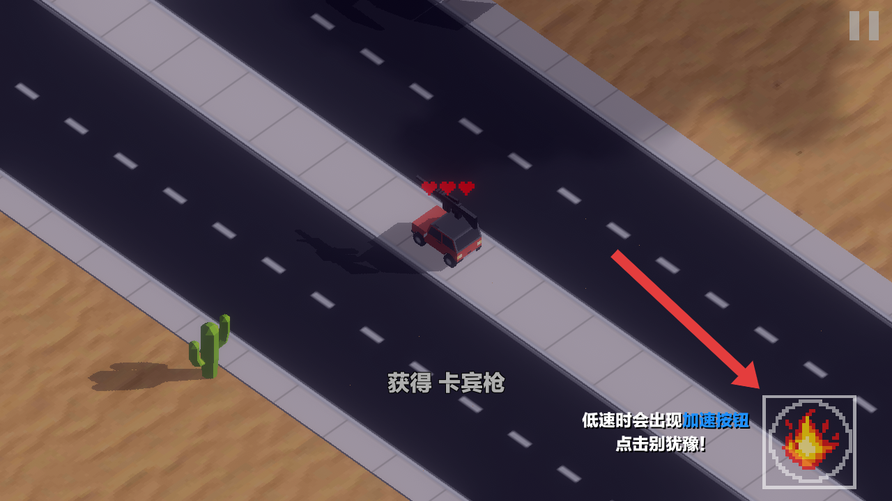 1、當(dāng)車輛低速時,需要點擊右側(cè)火焰加速按鈕提升車速,同時已獲取卡賓槍,為后續(xù)戰(zhàn)斗蓄力。