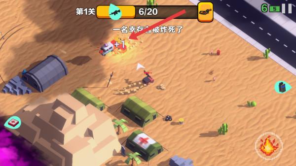 3、第1關(guān)的戰(zhàn)斗中,需要使用武器攻擊敵人,留意戰(zhàn)場態(tài)勢,注意當(dāng)前消滅6/20敵人,跟隨指引拾取道具。