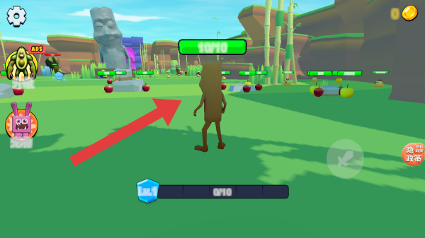 1、玩家處于有水果、雕像等元素的戶外場(chǎng)景,從風(fēng)格和元素看是卡通3D冒險(xiǎn)戰(zhàn)斗類,畫(huà)面含角色、場(chǎng)景、數(shù)值。