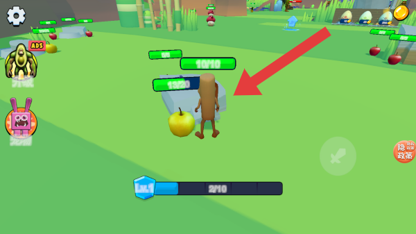 2、場(chǎng)景里有蘋(píng)果、香蕉等水果,還顯示有生命值數(shù)值、能量條,左下角有寵物或技能圖標(biāo),右下角有攻略按鈕。