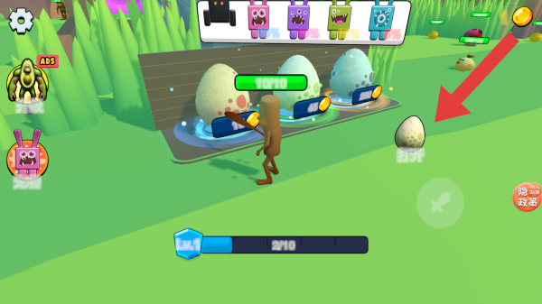 3、上方展示多種卡通形象,下方有孵化蛋的裝置,點(diǎn)擊打開(kāi),是冒險(xiǎn)養(yǎng)成類的玩法。