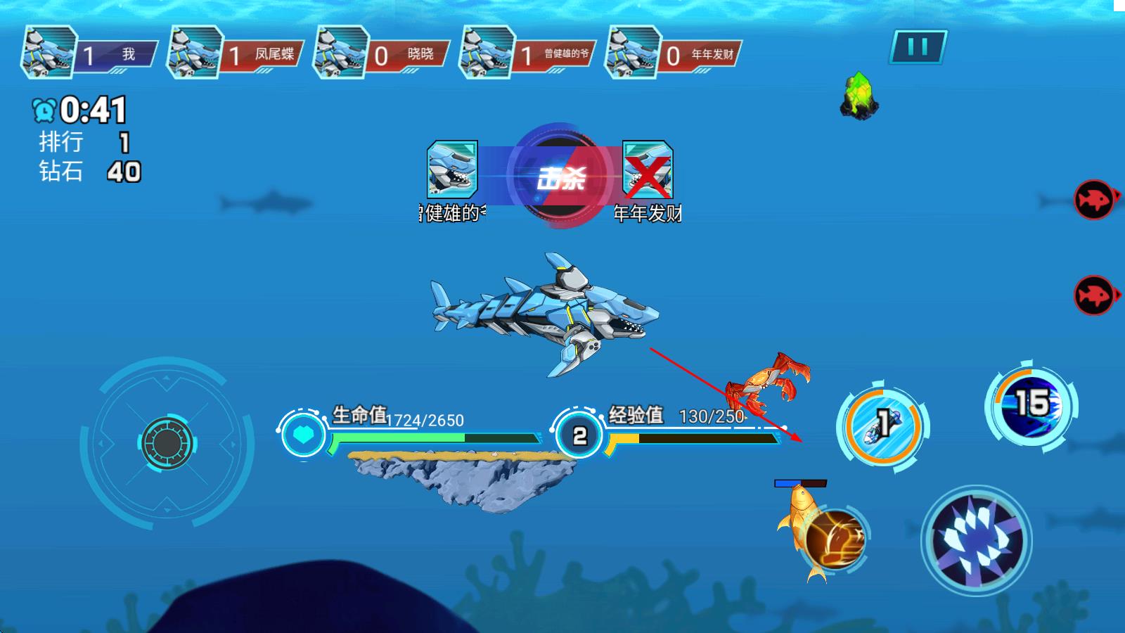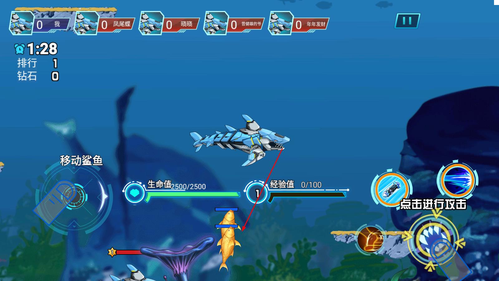 2、游戲過(guò)程中,接受各類(lèi)任務(wù)挑戰(zhàn),如高分比拼、狩獵目標(biāo),召喚鯊魚(yú)寶寶等寵物助力,利用沖刺、爆炸等技能應(yīng)對(duì)強(qiáng)大對(duì)手與障礙。
