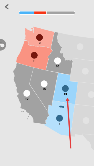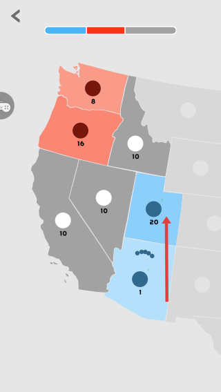 1、進(jìn)入游戲,點(diǎn)擊己方顏色區(qū)域藍(lán)紅灰的圓點(diǎn),拖動(dòng)兵力到相鄰敵方中立區(qū)域,數(shù)值大于目標(biāo)點(diǎn)即可占領(lǐng)。