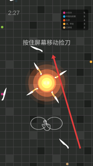 2、在游玩過程中,需要通過按住屏幕移動(dòng),來控制角色撿取飛刀,不斷增強(qiáng)自身戰(zhàn)斗能力。