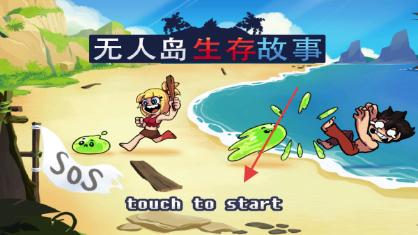 1、進(jìn)入游戲無人島生存故事界面,點(diǎn)擊touch to start按鈕,開啟游戲的冒險(xiǎn)挑戰(zhàn),進(jìn)入游戲的主場(chǎng)景。