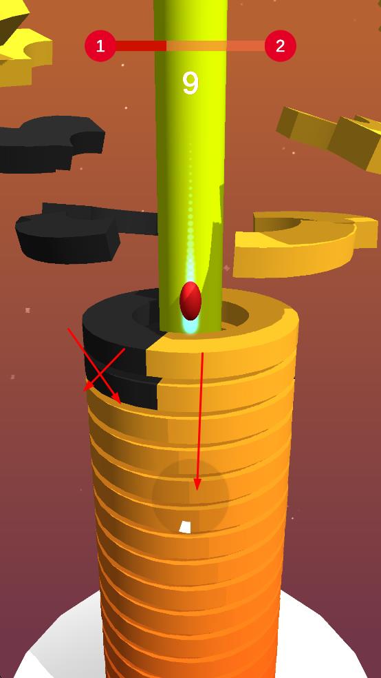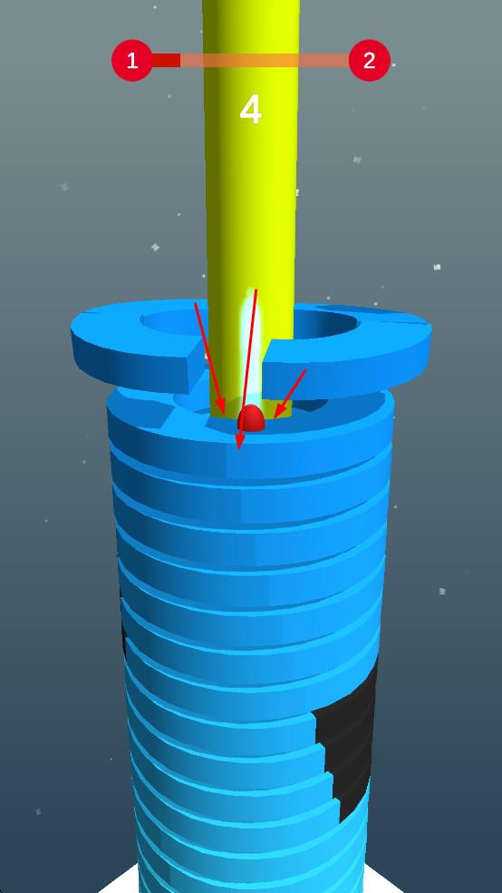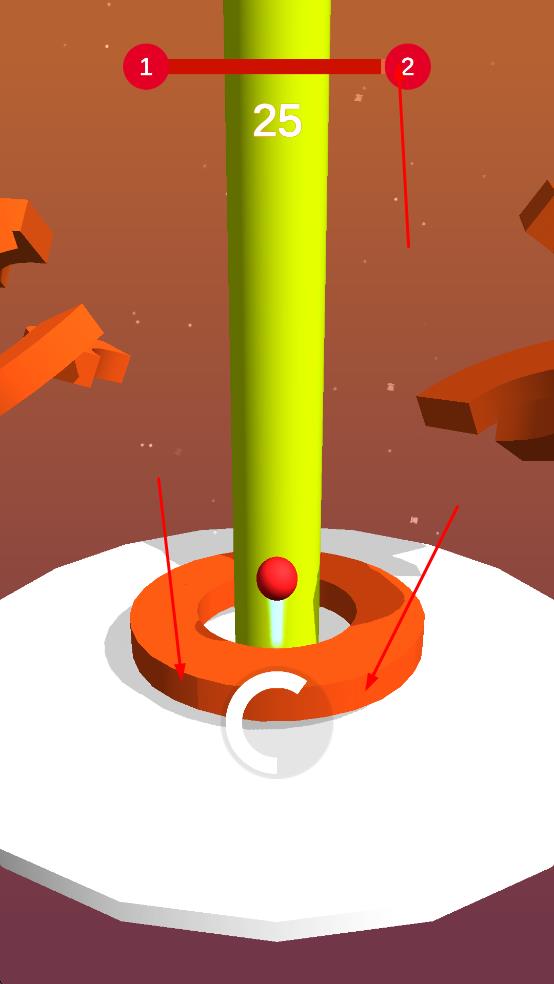 1、操控紅色小球在由不同顏色圓環(huán)組成的塔狀結(jié)構(gòu)中下落,需注意圓環(huán)上的缺口,引導(dǎo)小球通過缺口向下移動(dòng)。