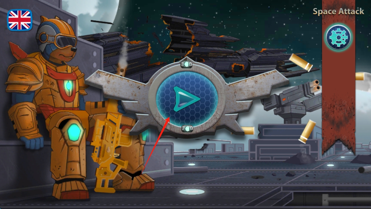 1、啟動游戲后,點擊開始按鈕,進入SpaceAttack,開啟刺激的太空射擊冒險之旅,點擊開始。
